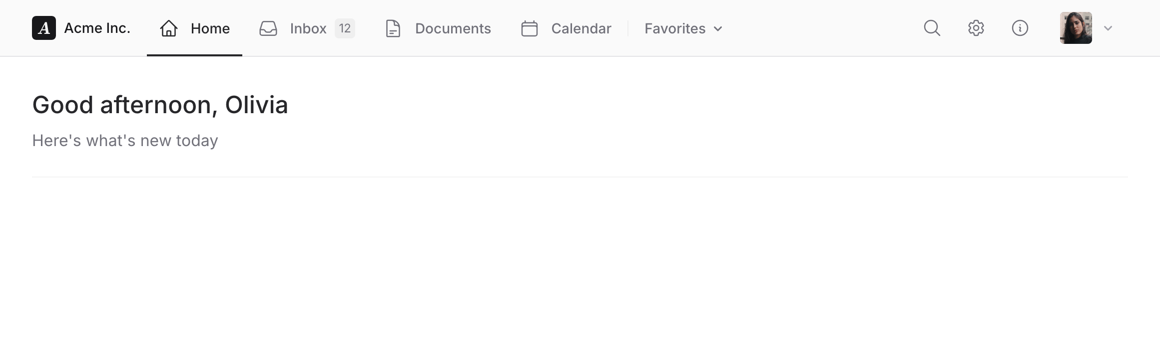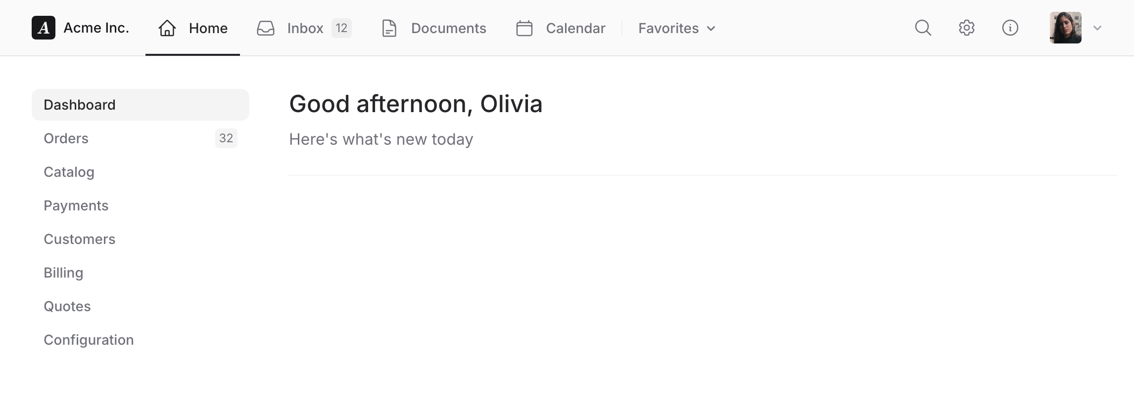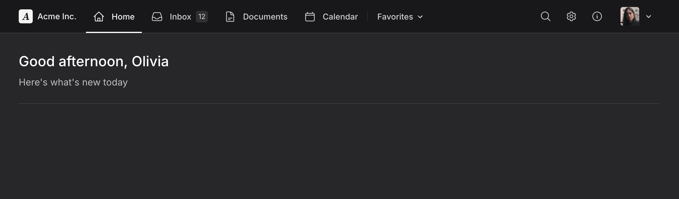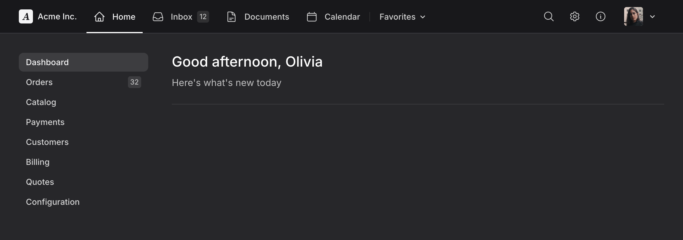 <head>    <!-- ... -->    @fluxAppearance</head><body class="min-h-screen bg-white dark:bg-zinc-800">    <flux:header container class="bg-zinc-50 dark:bg-zinc-900 border-b border-zinc-200 dark:border-zinc-700">        <flux:sidebar.toggle class="lg:hidden" icon="bars-2" inset="left" />        <flux:brand href="#" logo="https://fluxui.dev/img/demo/logo.png" name="Acme Inc." class="max-lg:hidden dark:hidden" />        <flux:brand href="#" logo="https://fluxui.dev/img/demo/dark-mode-logo.png" name="Acme Inc." class="max-lg:hidden! hidden dark:flex" />        <flux:navbar class="-mb-px max-lg:hidden">            <flux:navbar.item icon="home" href="#" current>Home</flux:navbar.item>            <flux:navbar.item icon="inbox" badge="12" href="#">Inbox</flux:navbar.item>            <flux:navbar.item icon="document-text" href="#">Documents</flux:navbar.item>            <flux:navbar.item icon="calendar" href="#">Calendar</flux:navbar.item>            <flux:separator vertical variant="subtle" class="my-2"/>            <flux:dropdown class="max-lg:hidden">                <flux:navbar.item icon:trailing="chevron-down">Favorites</flux:navbar.item>                <flux:navmenu>                    <flux:navmenu.item href="#">Marketing site</flux:navmenu.item>                    <flux:navmenu.item href="#">Android app</flux:navmenu.item>                    <flux:navmenu.item href="#">Brand guidelines</flux:navmenu.item>                </flux:navmenu>            </flux:dropdown>        </flux:navbar>        <flux:spacer />        <flux:navbar class="me-4">            <flux:navbar.item icon="magnifying-glass" href="#" label="Search" />            <flux:navbar.item class="max-lg:hidden" icon="cog-6-tooth" href="#" label="Settings" />            <flux:navbar.item class="max-lg:hidden" icon="information-circle" href="#" label="Help" />        </flux:navbar>        <flux:dropdown position="top" align="start">            <flux:profile avatar="https://fluxui.dev/img/demo/user.png" />            <flux:menu>                <flux:menu.radio.group>                    <flux:menu.radio checked>Olivia Martin</flux:menu.radio>                    <flux:menu.radio>Truly Delta</flux:menu.radio>                </flux:menu.radio.group>                <flux:menu.separator />                <flux:menu.item icon="arrow-right-start-on-rectangle">Logout</flux:menu.item>            </flux:menu>        </flux:dropdown>    </flux:header>    <flux:sidebar sticky collapsible="mobile" class="lg:hidden bg-zinc-50 dark:bg-zinc-900 border-r border-zinc-200 dark:border-zinc-700">        <flux:sidebar.header>            <flux:sidebar.brand                href="#"                logo="https://fluxui.dev/img/demo/logo.png"                logo:dark="https://fluxui.dev/img/demo/dark-mode-logo.png"                name="Acme Inc."            />            <flux:sidebar.collapse class="in-data-flux-sidebar-on-desktop:not-in-data-flux-sidebar-collapsed-desktop:-mr-2" />        </flux:sidebar.header>        <flux:sidebar.nav>            <flux:sidebar.item icon="home" href="#" current>Home</flux:sidebar.item>            <flux:sidebar.item icon="inbox" badge="12" href="#">Inbox</flux:sidebar.item>            <flux:sidebar.item icon="document-text" href="#">Documents</flux:sidebar.item>            <flux:sidebar.item icon="calendar" href="#">Calendar</flux:sidebar.item>            <flux:sidebar.group expandable heading="Favorites" class="grid">                <flux:sidebar.item href="#">Marketing site</flux:sidebar.item>                <flux:sidebar.item href="#">Android app</flux:sidebar.item>                <flux:sidebar.item href="#">Brand guidelines</flux:sidebar.item>            </flux:sidebar.group>        </flux:sidebar.nav>        <flux:sidebar.spacer />        <flux:sidebar.nav>            <flux:sidebar.item icon="cog-6-tooth" href="#">Settings</flux:sidebar.item>            <flux:sidebar.item icon="information-circle" href="#">Help</flux:sidebar.item>        </flux:sidebar.nav>    </flux:sidebar>    <flux:main container>        <flux:heading size="xl" level="1">Good afternoon, Olivia</flux:heading>        <flux:text class="mt-2 mb-6 text-base">Here's what's new today</flux:text>        <flux:separator variant="subtle" />    </flux:main>    @fluxScripts</body>使用侧边栏作为二级导航。