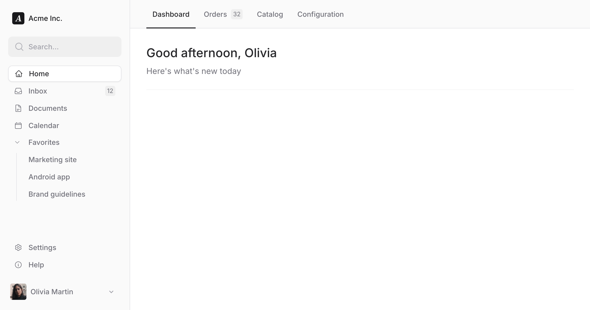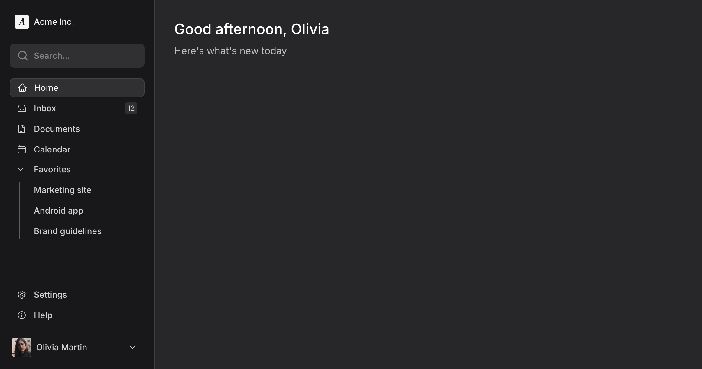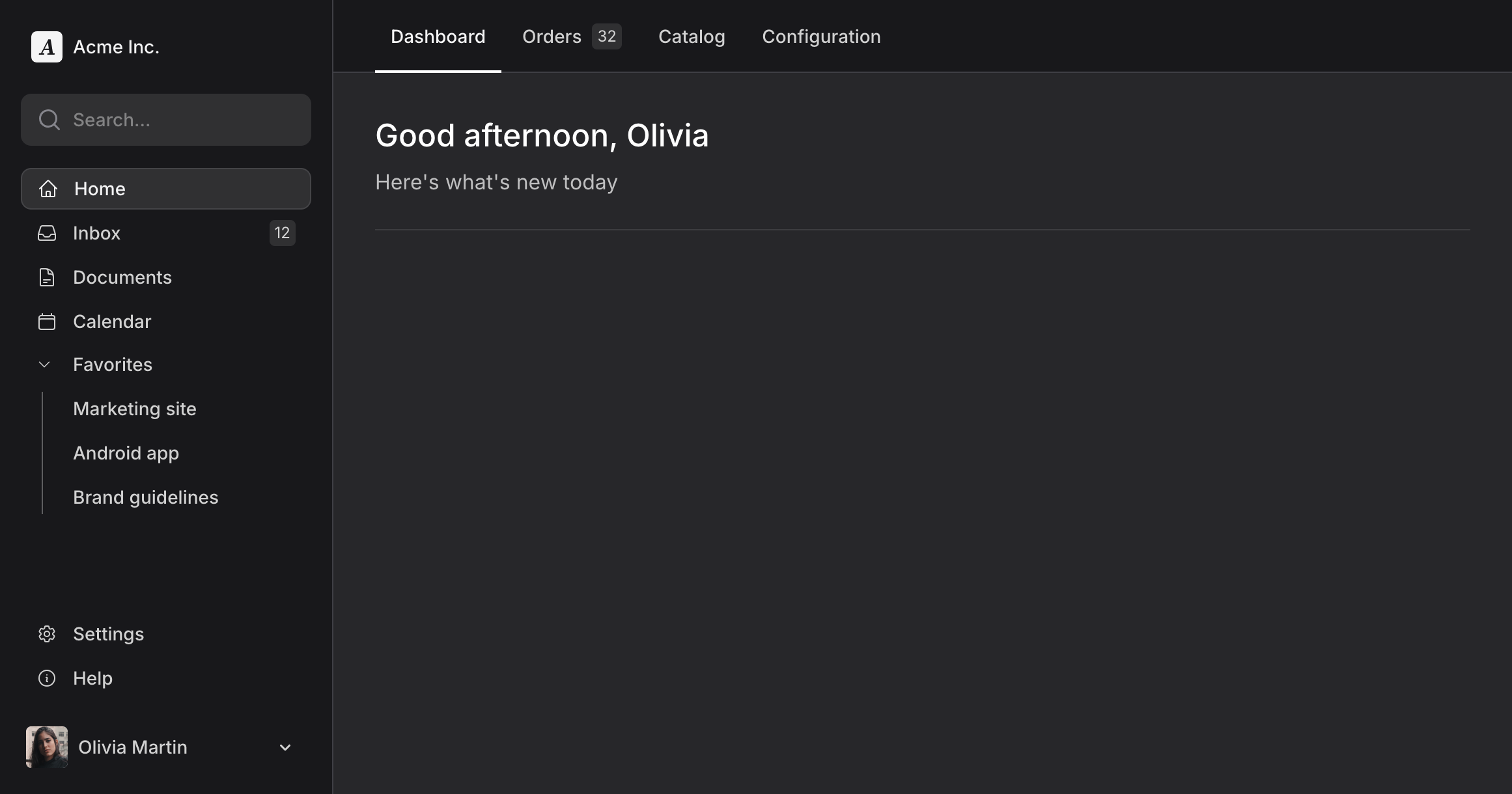 <head>    <!-- ... -->    @fluxAppearance</head><body class="min-h-screen bg-white dark:bg-zinc-800">    <flux:sidebar sticky collapsible="mobile" class="bg-zinc-50 dark:bg-zinc-900 border-r border-zinc-200 dark:border-zinc-700">        <flux:sidebar.header>            <flux:sidebar.brand                href="#"                logo="https://fluxui.dev/img/demo/logo.png"                logo:dark="https://fluxui.dev/img/demo/dark-mode-logo.png"                name="Acme Inc."            />            <flux:sidebar.collapse class="lg:hidden" />        </flux:sidebar.header>        <flux:sidebar.search placeholder="Search..." />        <flux:sidebar.nav>            <flux:sidebar.item icon="home" href="#" current>Home</flux:sidebar.item>            <flux:sidebar.item icon="inbox" badge="12" href="#">Inbox</flux:sidebar.item>            <flux:sidebar.item icon="document-text" href="#">Documents</flux:sidebar.item>            <flux:sidebar.item icon="calendar" href="#">Calendar</flux:sidebar.item>            <flux:sidebar.group expandable heading="Favorites" class="grid">                <flux:sidebar.item href="#">Marketing site</flux:sidebar.item>                <flux:sidebar.item href="#">Android app</flux:sidebar.item>                <flux:sidebar.item href="#">Brand guidelines</flux:sidebar.item>            </flux:sidebar.group>        </flux:sidebar.nav>        <flux:sidebar.spacer />        <flux:sidebar.nav>            <flux:sidebar.item icon="cog-6-tooth" href="#">Settings</flux:sidebar.item>            <flux:sidebar.item icon="information-circle" href="#">Help</flux:sidebar.item>        </flux:sidebar.nav>        <flux:dropdown position="top" align="start" class="max-lg:hidden">            <flux:sidebar.profile avatar="https://fluxui.dev/img/demo/user.png" name="Olivia Martin" />            <flux:menu>                <flux:menu.radio.group>                    <flux:menu.radio checked>Olivia Martin</flux:menu.radio>                    <flux:menu.radio>Truly Delta</flux:menu.radio>                </flux:menu.radio.group>                <flux:menu.separator />                <flux:menu.item icon="arrow-right-start-on-rectangle">Logout</flux:menu.item>            </flux:menu>        </flux:dropdown>    </flux:sidebar>    <flux:header class="lg:hidden">        <flux:sidebar.toggle class="lg:hidden" icon="bars-2" inset="left" />        <flux:spacer />        <flux:dropdown position="top" alignt="start">            <flux:profile avatar="https://fluxui.dev/img/demo/user.png" />            <flux:menu>                <flux:menu.radio.group>                    <flux:menu.radio checked>Olivia Martin</flux:menu.radio>                    <flux:menu.radio>Truly Delta</flux:menu.radio>                </flux:menu.radio.group>                <flux:menu.separator />                <flux:menu.item icon="arrow-right-start-on-rectangle">Logout</flux:menu.item>            </flux:menu>        </flux:dropdown>    </flux:header>    <flux:main>        <flux:heading size="xl" level="1">Good afternoon, Olivia</flux:heading>        <flux:text class="mb-6 mt-2 text-base">Here's what's new today</flux:text>        <flux:separator variant="subtle" />    </flux:main>    @fluxScripts</body>使用顶部页头承载次级导航。