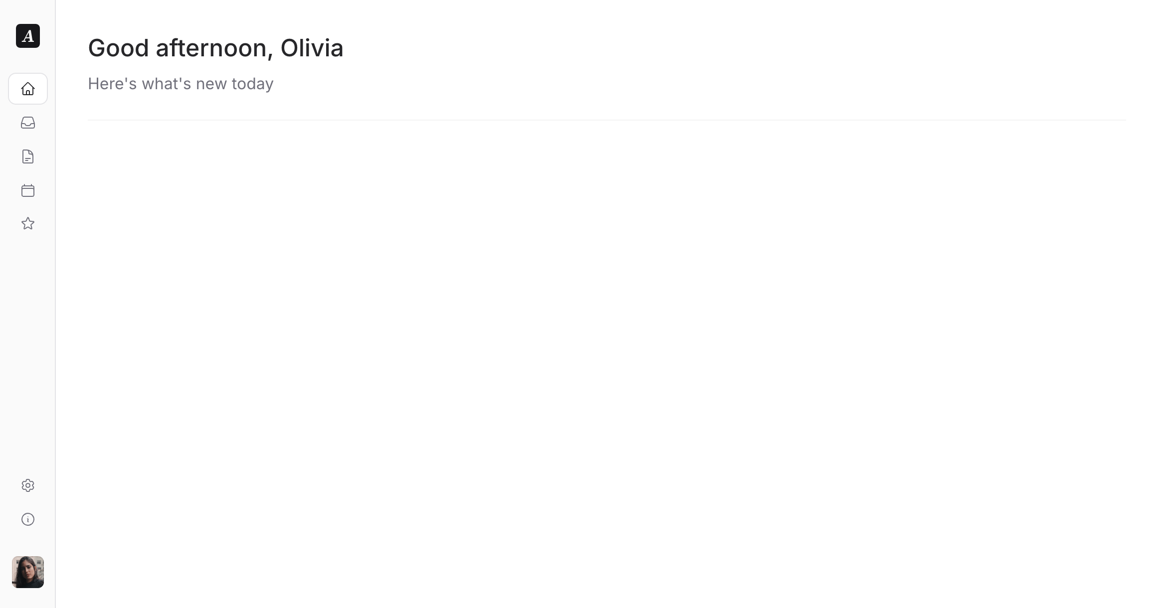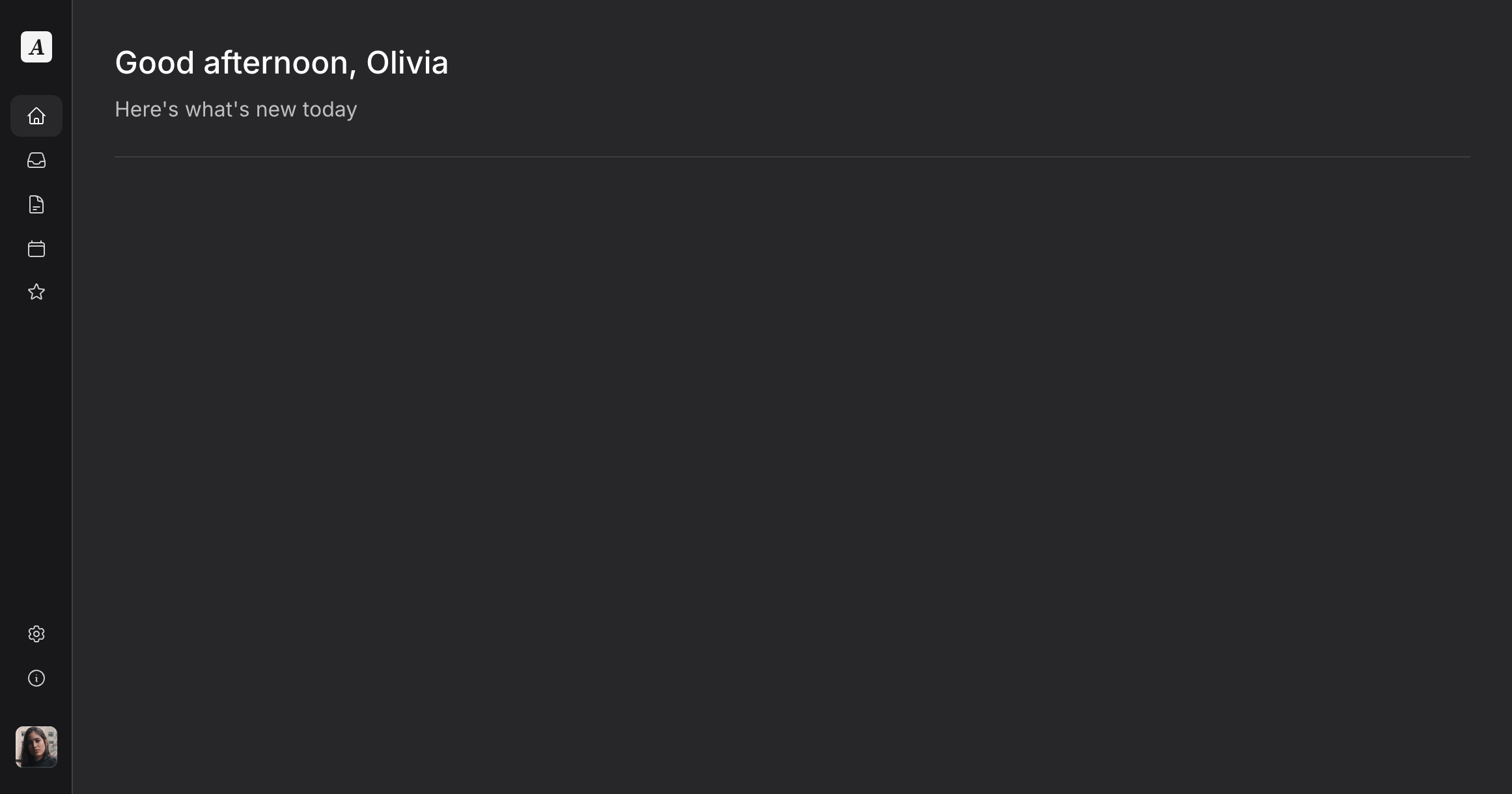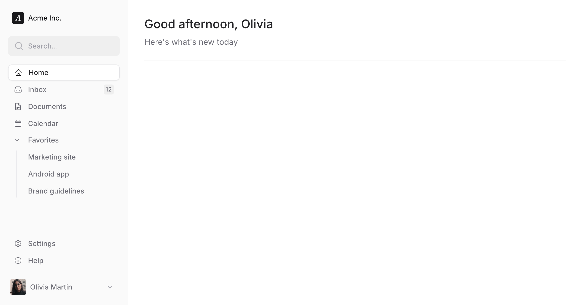 <head>    <!-- ... -->    @fluxAppearance</head><body class="min-h-screen bg-white dark:bg-zinc-800">    <flux:sidebar sticky collapsible="mobile" class="bg-zinc-50 dark:bg-zinc-900 border-r border-zinc-200 dark:border-zinc-700">        <flux:sidebar.header>            <flux:sidebar.brand                href="#"                logo="https://fluxui.dev/img/demo/logo.png"                logo:dark="https://fluxui.dev/img/demo/dark-mode-logo.png"                name="Acme Inc."            />            <flux:sidebar.collapse class="lg:hidden" />        </flux:sidebar.header>        <flux:sidebar.search placeholder="Search..." />        <flux:sidebar.nav>            <flux:sidebar.item icon="home" href="#" current>Home</flux:sidebar.item>            <flux:sidebar.item icon="inbox" badge="12" href="#">Inbox</flux:sidebar.item>            <flux:sidebar.item icon="document-text" href="#">Documents</flux:sidebar.item>            <flux:sidebar.item icon="calendar" href="#">Calendar</flux:sidebar.item>            <flux:sidebar.group expandable heading="Favorites" class="grid">                <flux:sidebar.item href="#">Marketing site</flux:sidebar.item>                <flux:sidebar.item href="#">Android app</flux:sidebar.item>                <flux:sidebar.item href="#">Brand guidelines</flux:sidebar.item>            </flux:sidebar.group>        </flux:sidebar.nav>        <flux:sidebar.spacer />        <flux:sidebar.nav>            <flux:sidebar.item icon="cog-6-tooth" href="#">Settings</flux:sidebar.item>            <flux:sidebar.item icon="information-circle" href="#">Help</flux:sidebar.item>        </flux:sidebar.nav>        <flux:dropdown position="top" align="start" class="max-lg:hidden">            <flux:sidebar.profile avatar="https://fluxui.dev/img/demo/user.png" name="Olivia Martin" />            <flux:menu>                <flux:menu.radio.group>                    <flux:menu.radio checked>Olivia Martin</flux:menu.radio>                    <flux:menu.radio>Truly Delta</flux:menu.radio>                </flux:menu.radio.group>                <flux:menu.separator />                <flux:menu.item icon="arrow-right-start-on-rectangle">Logout</flux:menu.item>            </flux:menu>        </flux:dropdown>    </flux:sidebar>    <flux:header class="lg:hidden">        <flux:sidebar.toggle class="lg:hidden" icon="bars-2" inset="left" />        <flux:spacer />        <flux:dropdown position="top" alignt="start">            <flux:profile avatar="https://fluxui.dev/img/demo/user.png" />            <flux:menu>                <flux:menu.radio.group>                    <flux:menu.radio checked>Olivia Martin</flux:menu.radio>                    <flux:menu.radio>Truly Delta</flux:menu.radio>                </flux:menu.radio.group>                <flux:menu.separator />                <flux:menu.item icon="arrow-right-start-on-rectangle">Logout</flux:menu.item>            </flux:menu>        </flux:dropdown>    </flux:header>    <flux:main>        <flux:heading size="xl" level="1">Good afternoon, Olivia</flux:heading>        <flux:text class="mb-6 mt-2 text-base">Here's what's new today</flux:text>        <flux:separator variant="subtle" />    </flux:main>    @fluxScripts</body>使用顶部页头承载次级导航。